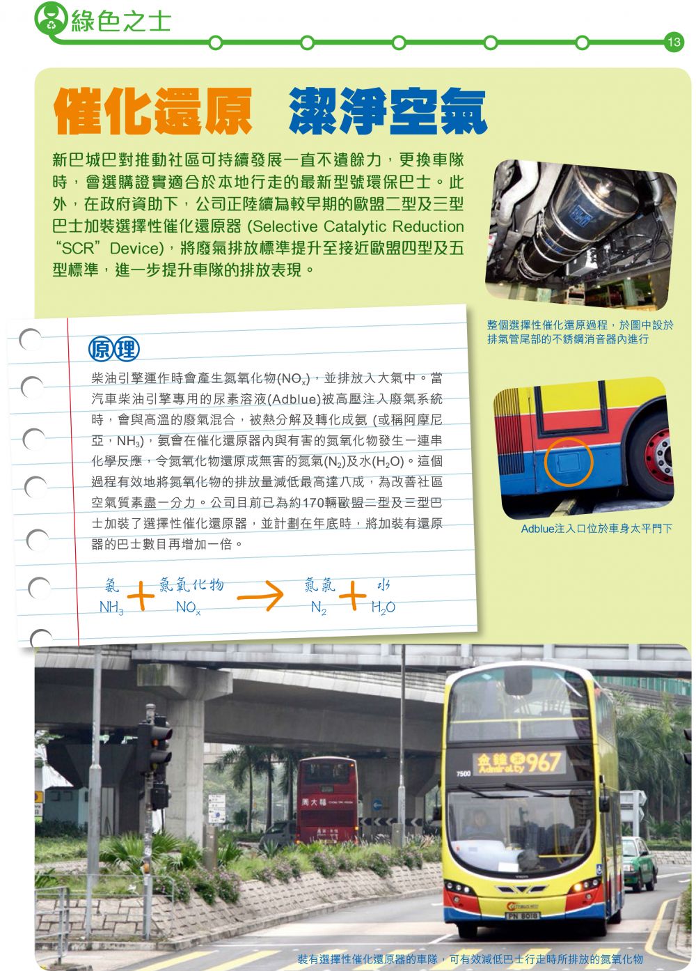 香港城巴Citybus的企業形象非常良好,提倡『綠色巴士,催化還原,潔淨空氣』,宣稱購買符合環保法規的巴士,也逐步將舊型的巴士加裝選擇性催化還原器 (Selective Catalytic Reduction“SCR”Device),將廢氣排放標準提升至接近歐盟四型及五型標準,進一步提升巴士的排放表現,率先建立減低巴士所排放的氮氧化物的企業責任形象。