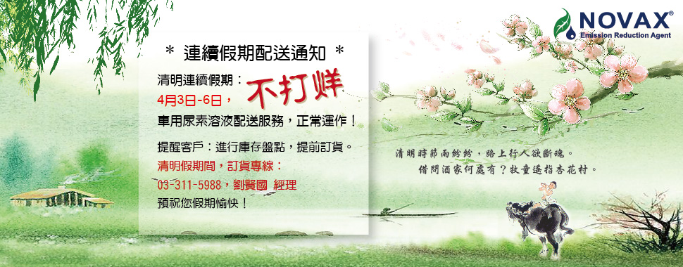 清明連續假期:4月3日-6日,諾瓦材料車用尿素溶液配送服務,正常運作! 提醒客戶:進行庫存盤點,提前訂...
