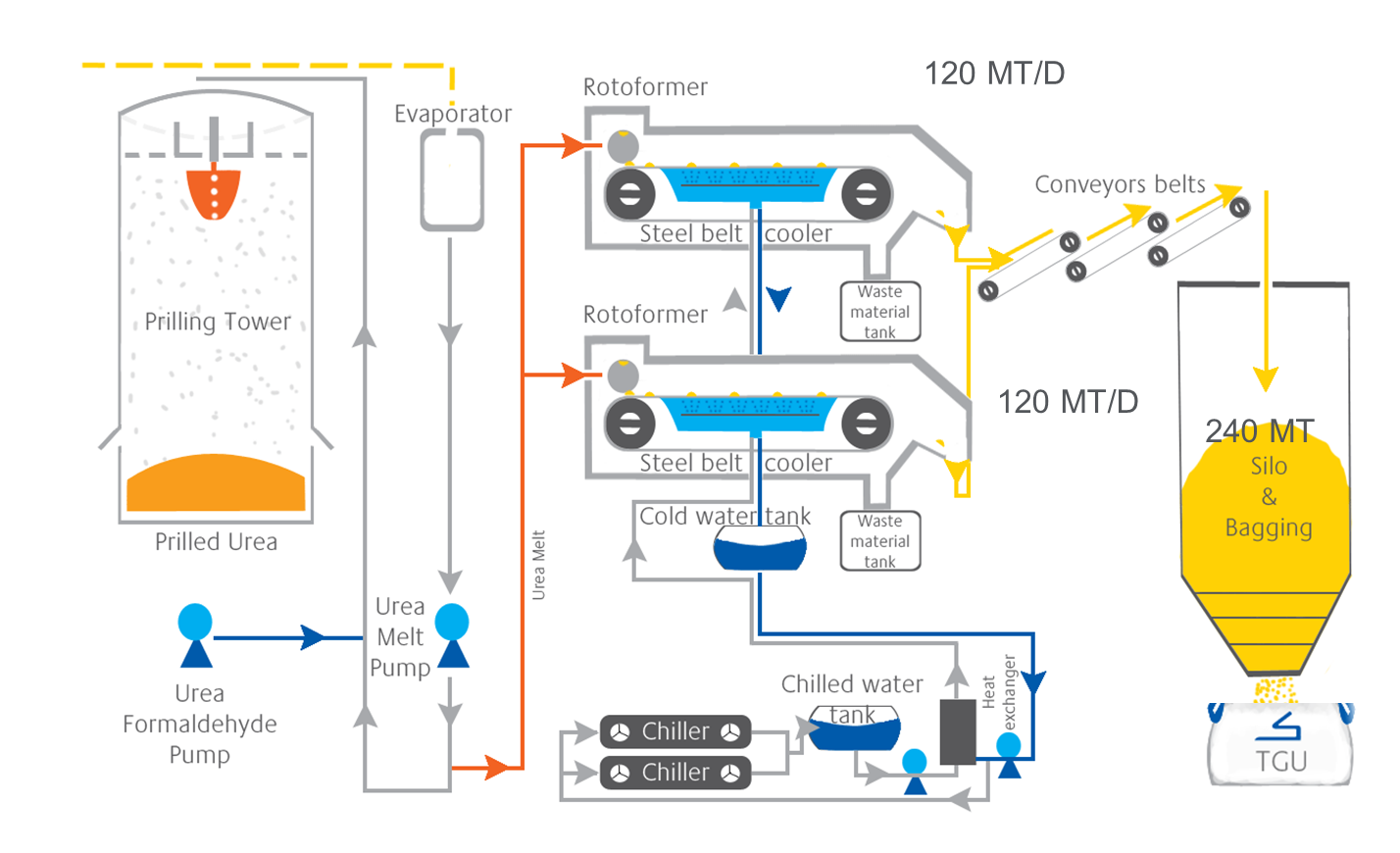 朱拜爾廠的技術級尿素顆粒產線,最大特點在於其熔融物料以計量液滴的形式滴落在不斷運行的輸送帶,當液滴隨產線運作時,熔融狀態的物料將釋放熱量,通過冷卻水,轉化成一顆顆均勻的尿素顆粒,此造粒技術,冷卻水和熔融狀態的物料不會彼此接觸,所以沒有交叉汙染的風險,如此,才能生產高潔淨度的技術級尿素顆粒,堪稱業界第一。