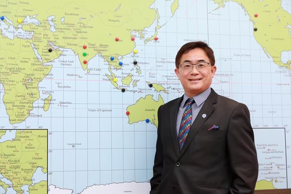 圖說:諾瓦材料科技董事長楊聯智於全球市場佈局圖前留影。